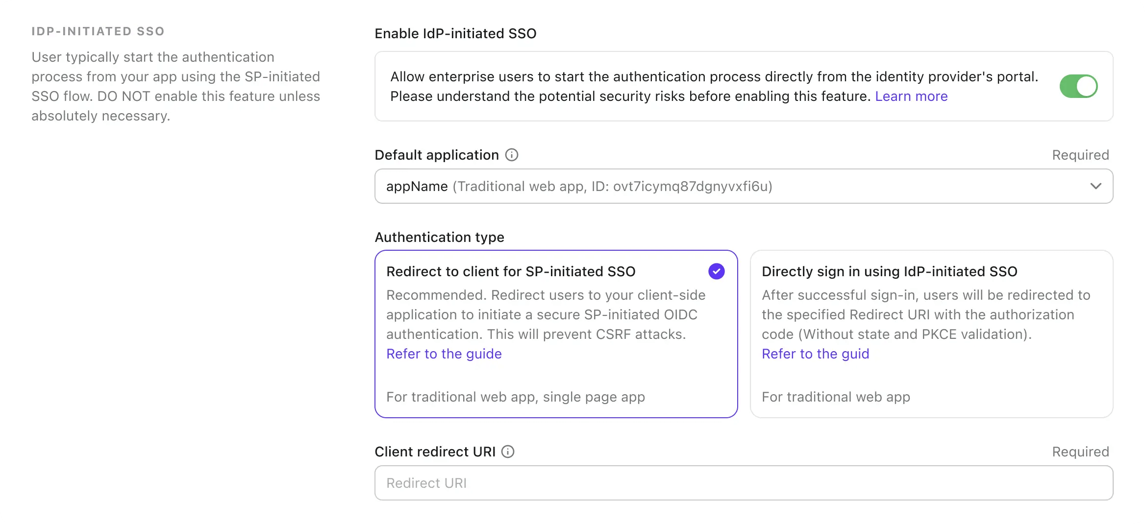 1. Provide a Client redirect URL to redirect the user to the default SP application after the IdP-initiated SSO flow. Logto will redirect the user to this URL with the ?ssoConnectorId={connectorId} query parameter appended to the URL. The client application should handle the redirection and initiate the OIDC authentication request. (We recommend using a dedicated route or page in your client application to handle the IdP-initiated SSO authentication request.)